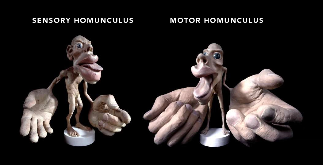 위의 그림에서 뇌의 고유수용계 감각기관 내용을 보면 가장 많은 영역을 차지하는 것이 손과 손가락입니다. 그래서 뇌과학자들은 고유수용계 영역이 차지하는 비율로 인간신체 지도를 그리는 작업을 하곤 하는데요, 그걸 허먼큘러스 인체지도라고 합니다.