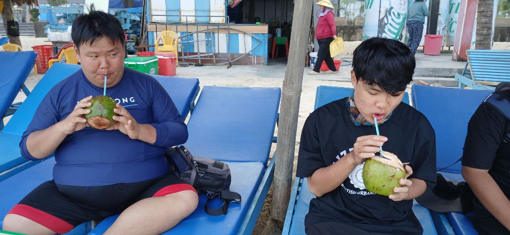 우리가 원하는 해변으로 왔을 때는 결국 이만보를 찍고야 말았습니다. 파도 여전히 높지만 들어가게 막는 것은 아니어서 녀석들 신나게 놀도록 놔둡니다. 코코넛도 시원하게 들이키고...