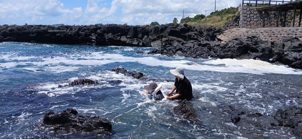 K녀석도 밀려드는 파도에 몸을 맡기고 물갈증을 해소해봅니다. 꽤 파고가 높은데도 그야말로 천연웅덩이처럼 구획된 곳에는 바위들이 파도를 부수어주니 험한 물살은 많이 완화되어 밀려듭니다. 여기저기 우리만의 천연수영장이 지천이라 시원한 여름보내기에 큰 도움이 됩니다.