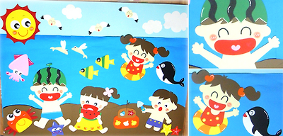 친구들이 바닷가에 놀러간 모습을 표현했다. 모래사장과 바닷가, 그리고 하늘의 모습을 배경으로 만든 후, 머메이드지로 수박모자 쓴 남자아이, 수박먹는 여자아이, 모래놀이하는 남자아이, 튜브 탄 여자아이, 꽃게, 모래케이크, 불가사리, 물고기, 갈매기, 구름 해 등을 오려 붙인다.