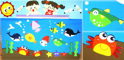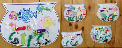도화지에 물고기 어항 밑그림을 그려 오린 후, 아이들에게 나눠준다. 싸인펜, 색연필 등으로 어항 속을 상상하여 아이들이 그리도록 한다. 아이클레이로 물고기, 물방울, 해초 등을 만들어 붙여준다. 완성작을 교실벽면에 장식한다.