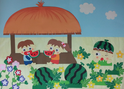 수박밭의 원두막에서 수박을 먹고 있는 친구들의 모습을 표현했다. 머메이드지로 남자아이, 여자아이, 수박모자 쓴 아이, 수박, 나팔꽃, 원두막 등을 오려 붙인다.