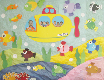 아이들이 잠수함을 타고 바다 속을 여행하는 모습을 표현했다. 다양한 색상의 한지로 배경을 꾸며준 후, 머메이드지로 잠수함, 물고기, 해초 등을 오려 붙인다. 반 아이들의 사진을 프린트 하여 잠수함 속에 붙여주면 더욱 실감나는 환경판 완성!
