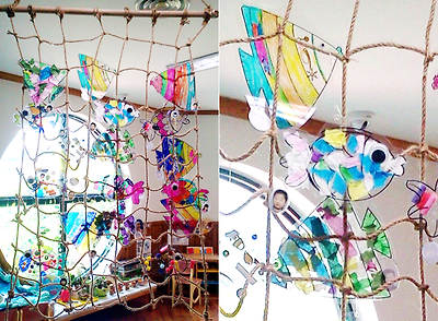 OHP필름에 물고기 밑그림을 그려 오린 후, 아이들에게 나눠준다. 네임펜, 스티커, 뿅뿅이 등을 이용해 아이들이 자유롭게 꾸미도록 한다. 나뭇가지에 가벼운 노끈이나 지끈 등을 사용하여 연결해준다.