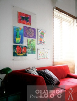 집 안의 메인 공간인 거실에 아이의 그림이 걸리면 아이도 스스로 뿌듯해한다. 번듯하게 액자에 넣어 소파 뒤 벽에 걸어 두면 피카소 작품이 부럽지 않을 듯. 대형 아크릴 액자는 저렴한 가격에 맞출 수 있고 여러 장의 그림을 한꺼번에 걸 수 있으며 그림을 바꿔 걸기도 쉬워서 안성맞춤이다. 을지로나 동네 아크릴 가게에서 동일한 사이즈의 아크릴을 2장 주문한다. 네 귀퉁이에 아크릴 보드 다보를 끼우기만 하면 되는데, 아크릴을 주문할 때 다보 끼울 구멍을 내달라고 하면 된다. 아크릴 뒤판에 그림을 여러 장 붙인 후 다시 아크릴 앞판을 붙이고 다보 나사를 돌려 끼우기만 하면 되니 그림을 갈아 넣기가 간편하다. 큰 액자 옆의 작은 아크릴 액자는 인테리어 매장에서 쉽게 구입할 수 있는 기성 제품.