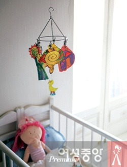 평면적인 그림을 입체적으로 장식할 수 있는 아이디어. 그림을 잘라도 좋고 아이가 유치원에서 만들어 온 그림 카드 등을 활용해도 좋다. 고속 터미널이나 인테리어 소품을 파는 인터넷 쇼핑몰에서 쉽게 구입할 수 있는 모빌 틀을 활용해 모빌 틀에 달린 집게에 그림만 걸어 두면 끝. 좀 심심하다 싶으면 컬러 철사에 그림을 끼워 걸어도 좋다. 침대 헤드나 벽 조명 등을 활용해 걸어도 된다.