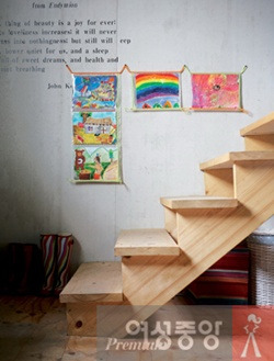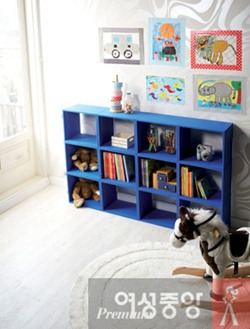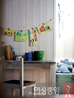 대형 문구점이나 인터넷 쇼핑몰에서 구입할 수 있는 모양 테이프를 활용해 아이와 함께 그림을 걸면 아이도 재미있어 한다. 아이의 그림 색깔에 맞추어 어울리는 테이프를 그림 주위에 돌려 붙여 프레임을 만들어 주는 것. 값비싼 액자보다 더 스타일이 산다. 포인트는 컬러 매치를 상큼하게 하는 것.