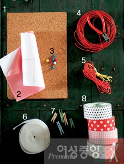1 코르크판 타커나 양면테이프로 벽면 어디에나 고정하기 쉽고 그 위에 압정을 꽂으면 어떤 작품이든 걸 수 있다. 대형 문구점 등에서 판매.