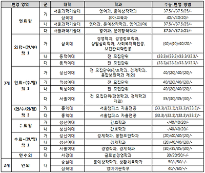 -하지만 논술 중심 전형은 우선선발의 경우 최상위권 대학은 국어, 영어, 수학을 지정 반영하고 있다.