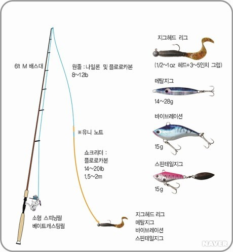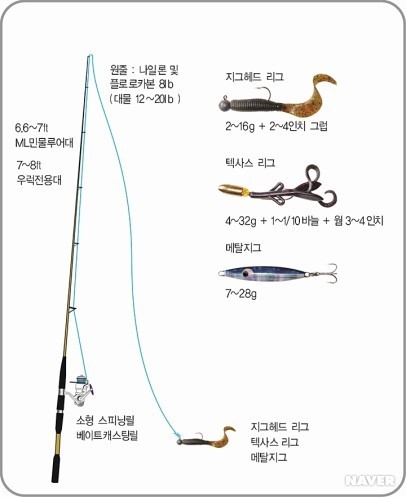 루어 : 지그헤드 리그(지그헤드 2~16g +그럽 2~4인치), 텍사스 리그(봉돌 4~32g + 1~1/0바늘 +각종 웜 3~4인치), 메탈지그(7~28g)