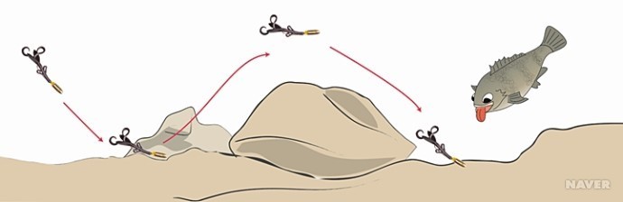 루어를 바닥의 암초 주위까지 내리는 것이 기본조건이다. 연안낚시에서와 마찬가지로 수중여와 같은 장애물에 루어를 바짝 붙여야 좋은 조과를 올릴 수 있다.