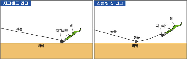 하지만 줄끼리 엉키는 일이 잦고, 웜의 움직임이 스플릿 샷 리그보다 부자연스럽다는 단점이 있다.