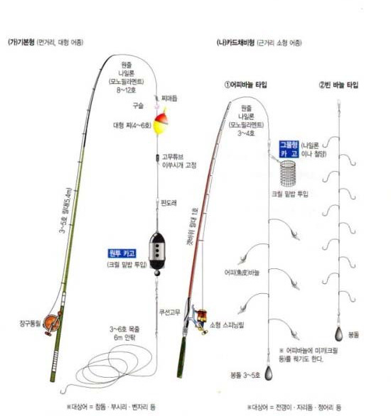 중, 상층 회유어에서부터 바닥층의 감성돔이나 황어, 우럭, 노래미에 이르기까지 대부분 어종에 구사됩니다.