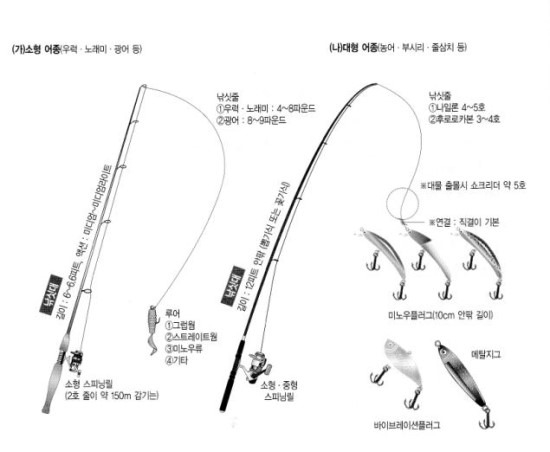 민물의 쏘가리 또는 배스용 낚싯대와 릴 및 루어를 고스란히 활용할수 있습니다.