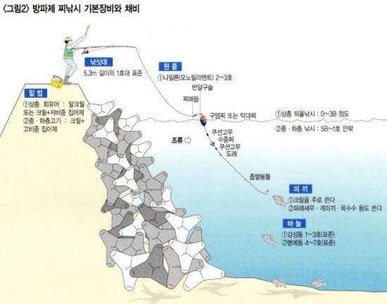 방파제에서 쓰이는 채비는 파도가 잔잔하고 조류가 완만한 지역과 시기에는