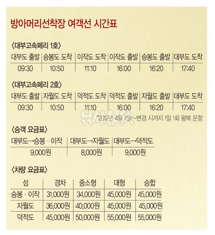 낚싯배를 이용하지 않고 덕적도, 이작도, 승봉도 등으로 곧바로 들어가고 싶다면 시화방조제 서쪽의 방아머리 선착장에서 여객선을 타는 방법도 있다. 두 척의 철부선이 하루 1회씩 운항 중인데 요금은 인천항 코스보다 저렴하고 소요 시간은 비슷해 메리트가 있다.