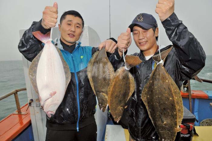 ▲ “보령과 군산에서만 잘 낚이는 줄 알았던 광어가 인천에서도 흔하군요” 광어 조과를 자랑하는 낚시인들. 광어는 빠르면