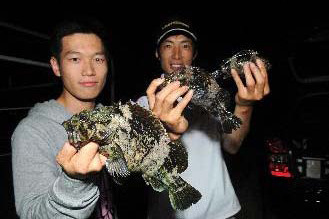 ▲ “이런 녀석들이 동해안에서 잡힙니다.” 김덕용(좌)씨와 이대성씨가 굵은 개볼락을 자랑하고 있다.
