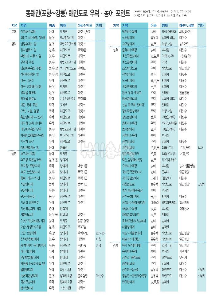 재밌는 것은 삼척시내에서 울진 쪽으로 내려 갈수록 씨알이 잔 반면 군인들의 통제가 덜한 편이어서 융통성 있게 밤낚시를 할 수 있다는 것이다. 반면 강릉 쪽으로 올라갈수록 굵은 씨알이 낚이지만 저녁 8시(동절기는 6시 전후)면 어김없이 낚시인들의 출입을 통제하기 때문에 낚시시간이 짧다.