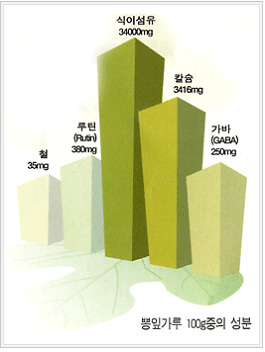 ● 혈압강하물질 GABA풍부 (녹차의 10배) ● 모세혈관 강하물질Rutin풍부 (녹차의 3.8배) ● 칼슘이 풍부 (시금치의 50배, 우유의 27배) ● 다이어트 증진 효과 (식이섬유가 녹차의 3배) ● 미네랄이 가득