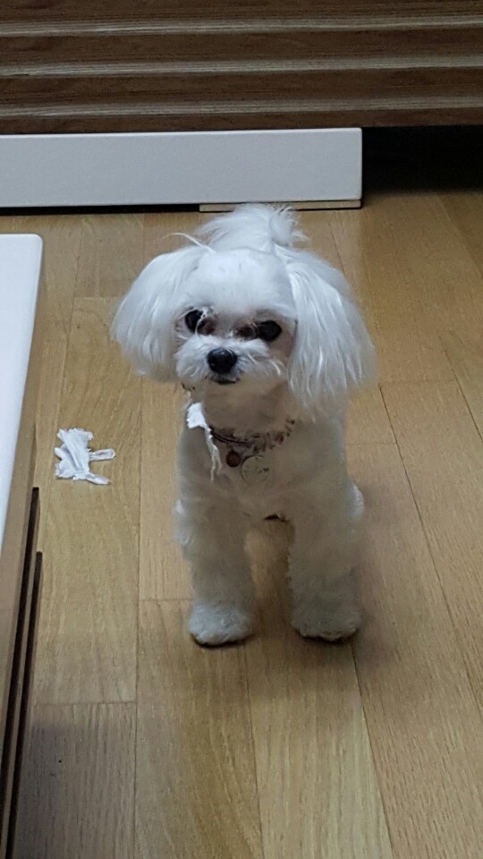 공주가 휴지랑 종이컵 같은것들을 어디선가 기가막히게 찾아와서 가끔 저렇게 물어뜯고 흔적을 남기네요 ㅋㅋ 자기 입에 휴지 붙은 것도 모르고 당당하게 와서 쳐다보고 있는 귀염둥이♡♡