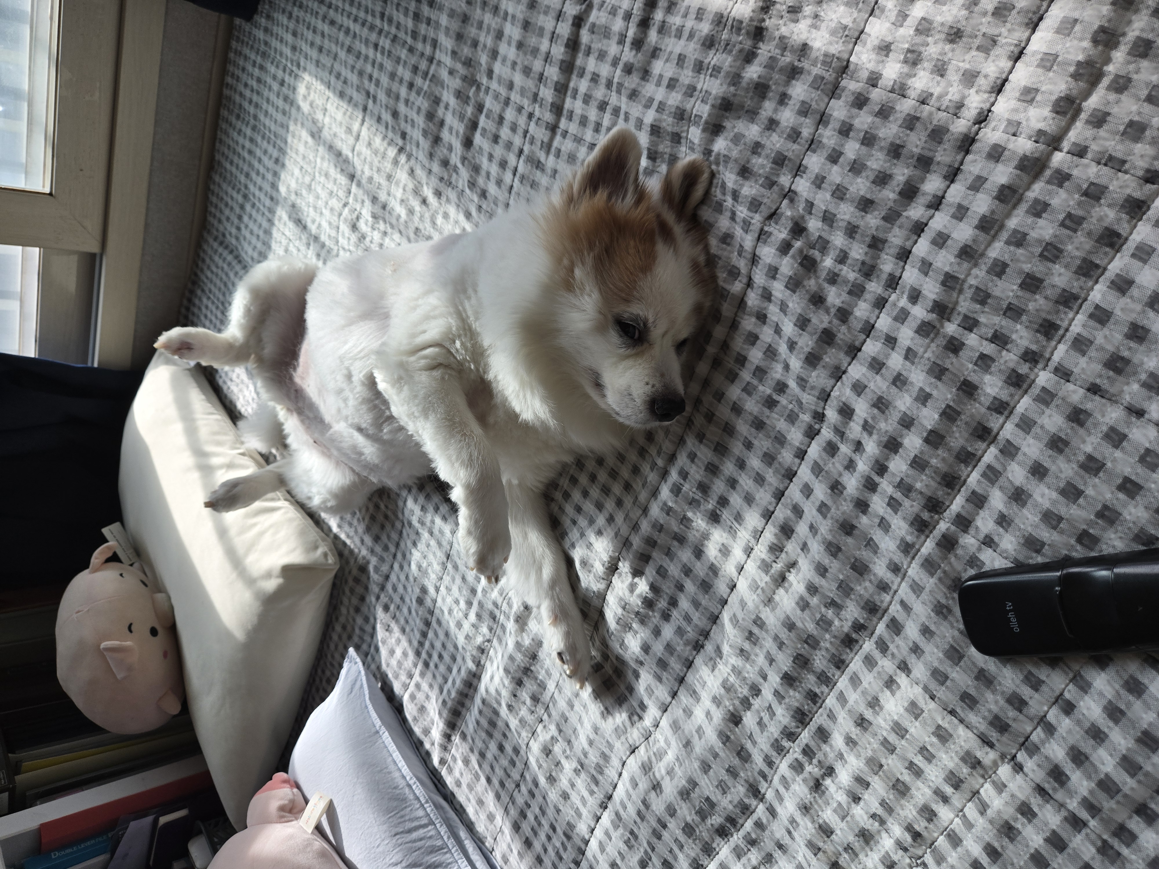 소진이는 나이가 들면서 피부에 많이 퍼지고 있어서 긁고 귀도 염증이 생겨서 소독도 해주고 있어요 소독할때 물려고하고 털좀 깍아주려고하면 이빨을 드러낸답니다 평상시엔 얌전하고 소리도 안내는데 ᆢ 지금은 날씨가 따뜻해져서 잘자고있는데 수시로 문열라고해서 추울때도 있어요~