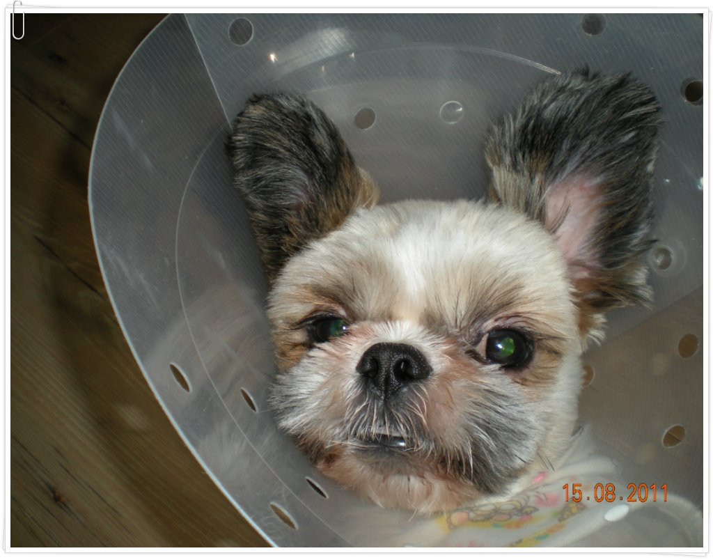 자꾸 긁어대서 목에 다시 칼라를 씌웠습니다.