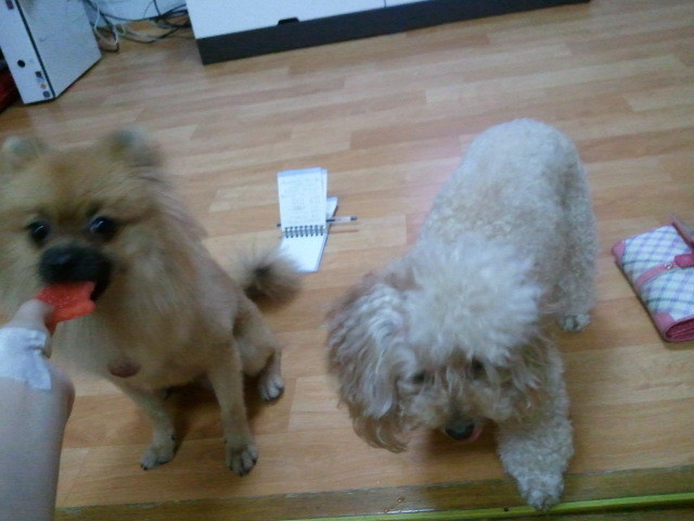 암튼잘먹고 잘싸고 잘자고그래요 짖는거는작아서웃기고~ 귀속은마니좋아졌으용 계속치료중입니다