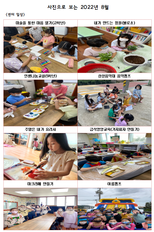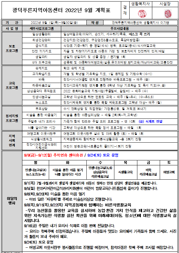 광덕푸른지역아동센터 2022년 9월 월별계획표 작성자광덕푸른|작성시간22.09.01|조회수121 목록 댓글 0 글자크기 작게가 글자크기 크게가 안녕하세요 ~ 언제 더웠냐는 듯이 바람이 선선하게 부는 계절이 돌아왔습니다.가족들과 함께 즐겁고 풍요로운 추석 보내시기를 바랍니다. ^^ 다음검색 현재 게시글 추가 기능 열기 북마크 신고 센터로 신고 댓글 댓글 0 댓글쓰기 답글쓰기 댓글 리스트