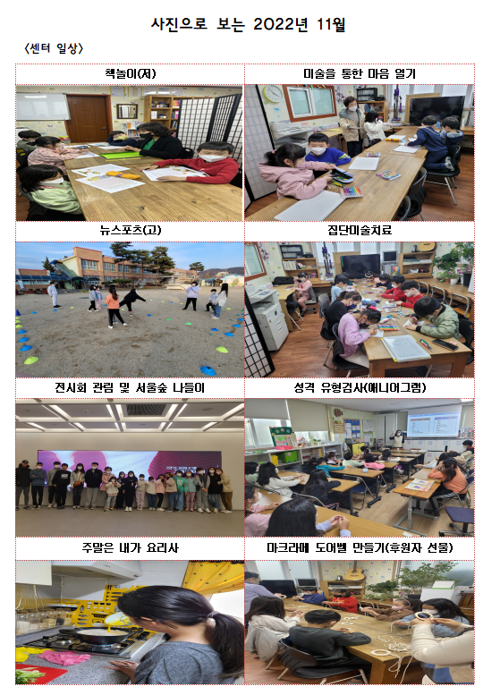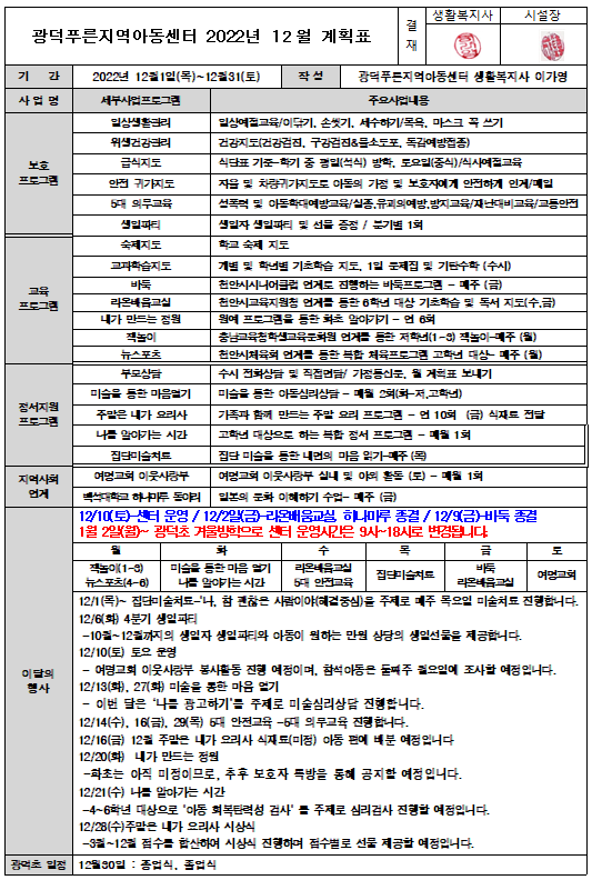 광덕푸른지역아동센터 2022년 12월 월별계획표 작성자광덕푸른|작성시간22.12.02|조회수109 목록 댓글 0 글자크기 작게가 글자크기 크게가 안녕하세요 오랜만에 인사드립니다~12월을 코앞에 두고 기다리던 첫눈이 내렸네요ㅎㅎ추워진 날씨 감기 조심하시고 남은 한달 행복하고 즐겁게 보내세요.올해도 정말 감사했습니다~ㅎㅎ 다음검색 현재 게시글 추가 기능 열기 북마크 신고 센터로 신고 댓글 댓글 0 댓글쓰기 답글쓰기 댓글 리스트