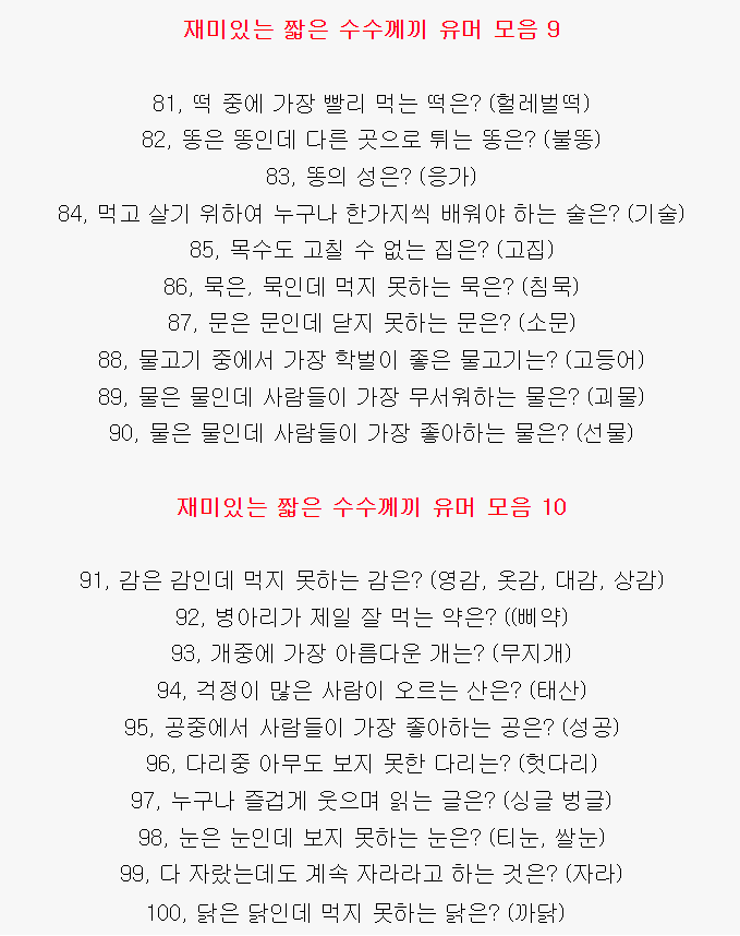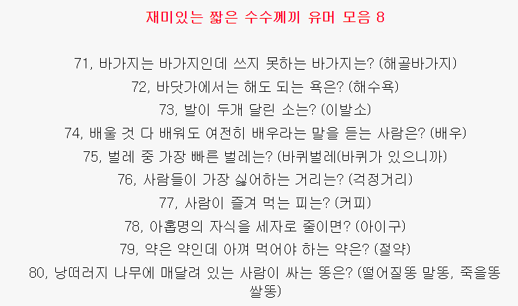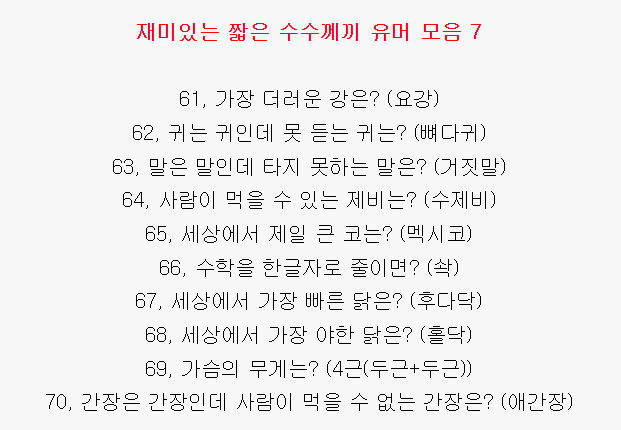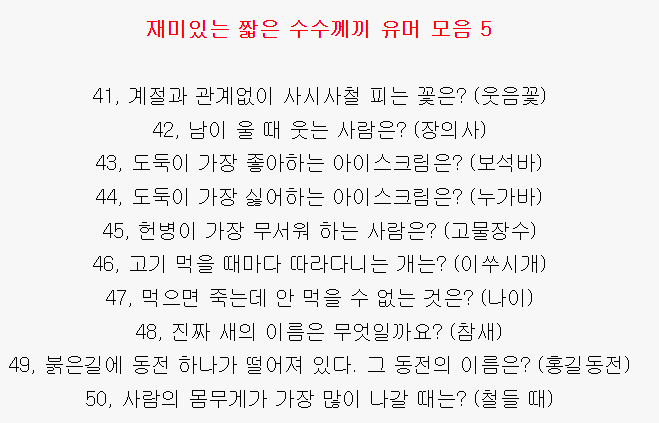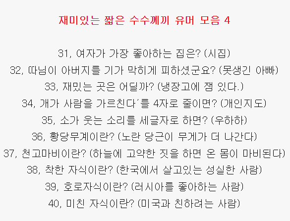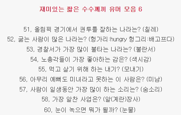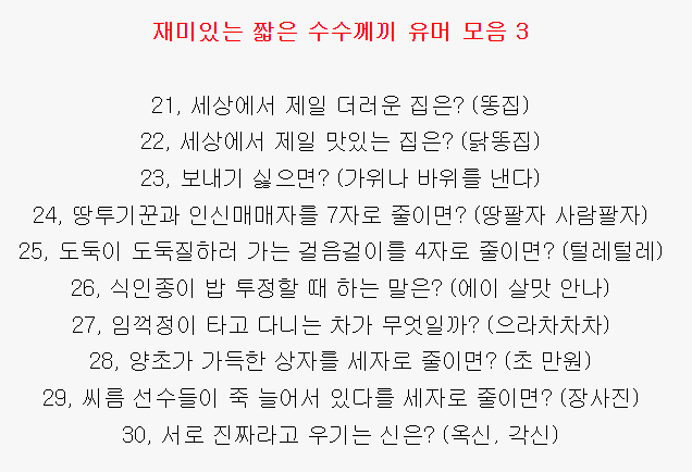 재미있는 짧은 수수께끼 유머모음 작성자농사꾼꾼|작성시간21.03.23|조회수7,789 목록 댓글 0 글자크기 작게가 글자크기 크게가 다음검색 현재 게시글 추가 기능 열기 북마크 공유하기 신고 센터로 신고 댓글 댓글 0 댓글쓰기 답글쓰기 댓글 리스트