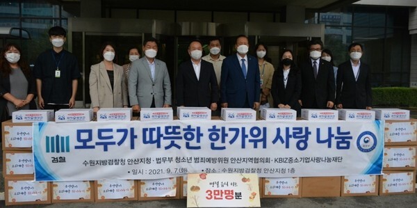 법무부청소년범죄예방 시흥지구위원회에서 추석음식 키트 3박스를 시흥시1%복지재단에 전달했다.