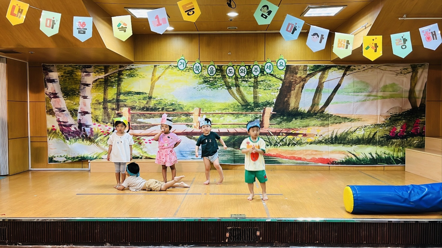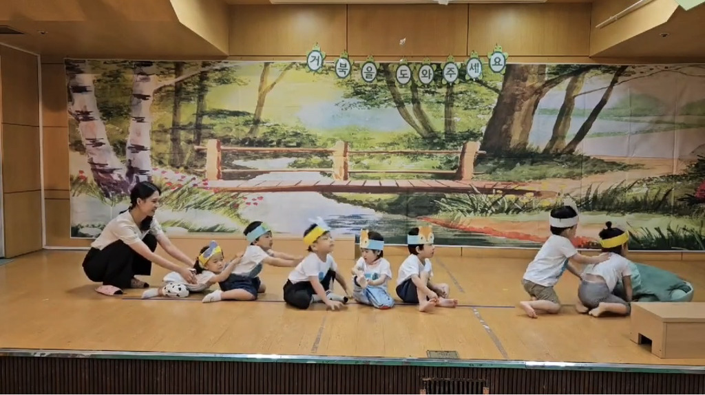 부모님들께서 직접 아이들이 맡은 역할 머리띠도 해주시고 다들 대기실에서 대기했다가 한 달 동안 연습한 동극을 해보았어요~