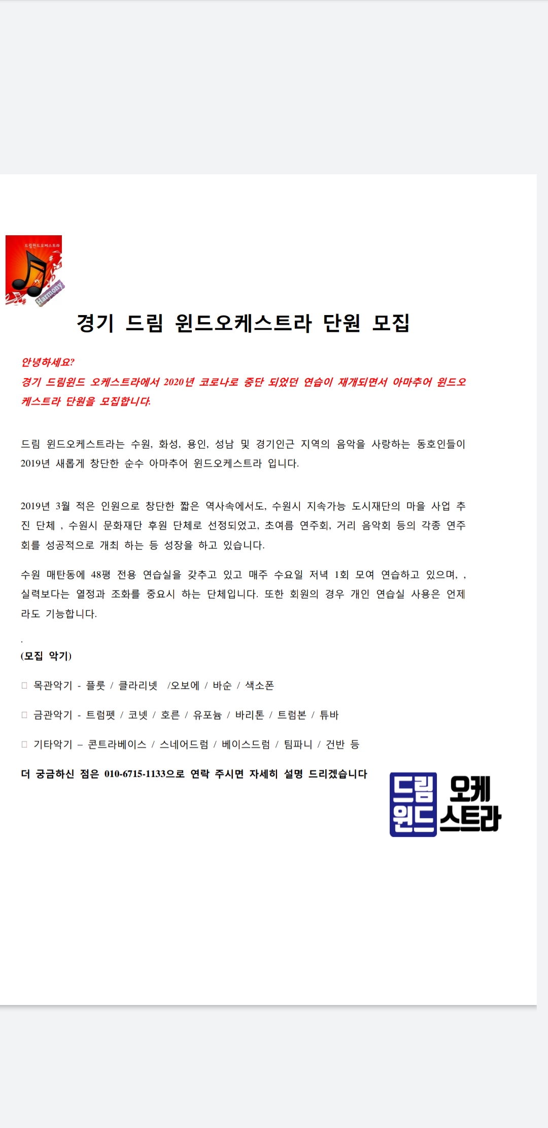 드림윈드오케스트라 단원모집합니다. 작성자최강클라|작성시간20.11.04|조회수117 목록 댓글 0 글자크기 작게가 글자크기 크게가 다음검색 현재 게시글 추가 기능 열기 북마크 공유하기 신고 센터로 신고 댓글 댓글 0 댓글쓰기 답글쓰기 댓글 리스트