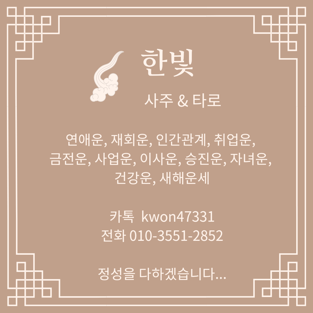 내담자분의 묵은 고민을 시원하게 날려드리는 사주 & 타로 마스터 "한빛"입니다.
