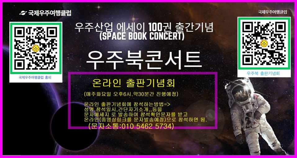 | [우주북 콘서트 추진위원회(우콘추)] [우주북 콘서트 추진방향 및 컨셉] 우주EXPO, 우주콘서트, 우주인오디션(예비우주인선발대회),, 등 각종 국제적EVENT를 통하여 K-POP, K-SPORT, K-CULTURE,, 등을 융합한 K-우주(K-SPACE)우주엔터산업발전을 도모하며 민간우주산업발전을 위하여 해외 및 전국민적 관심과 성원을 증폭시키기 위한 컨셉을 추구한다 |