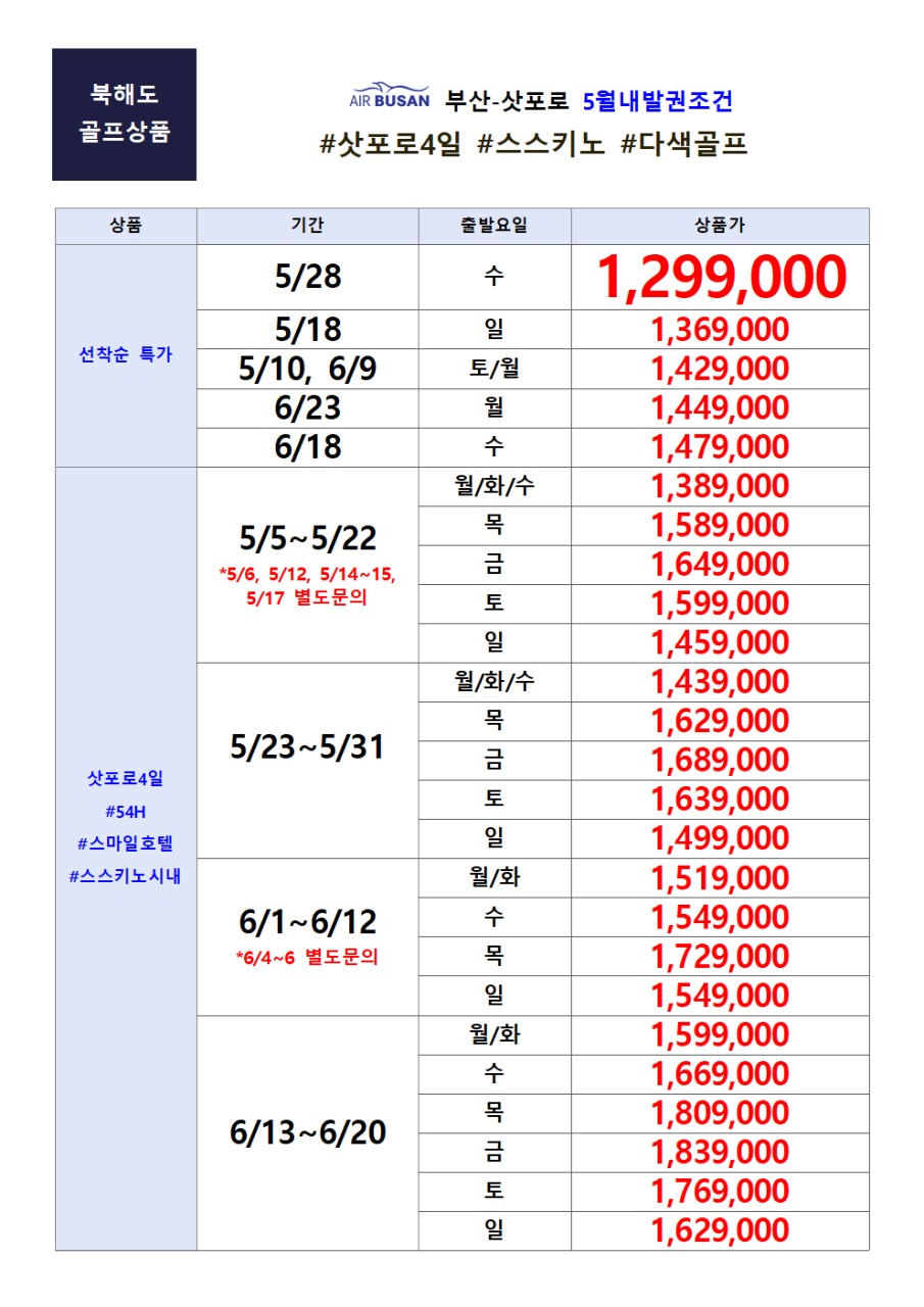 📢북해도 4일 시내호텔+3색골프 선착순 특가!!