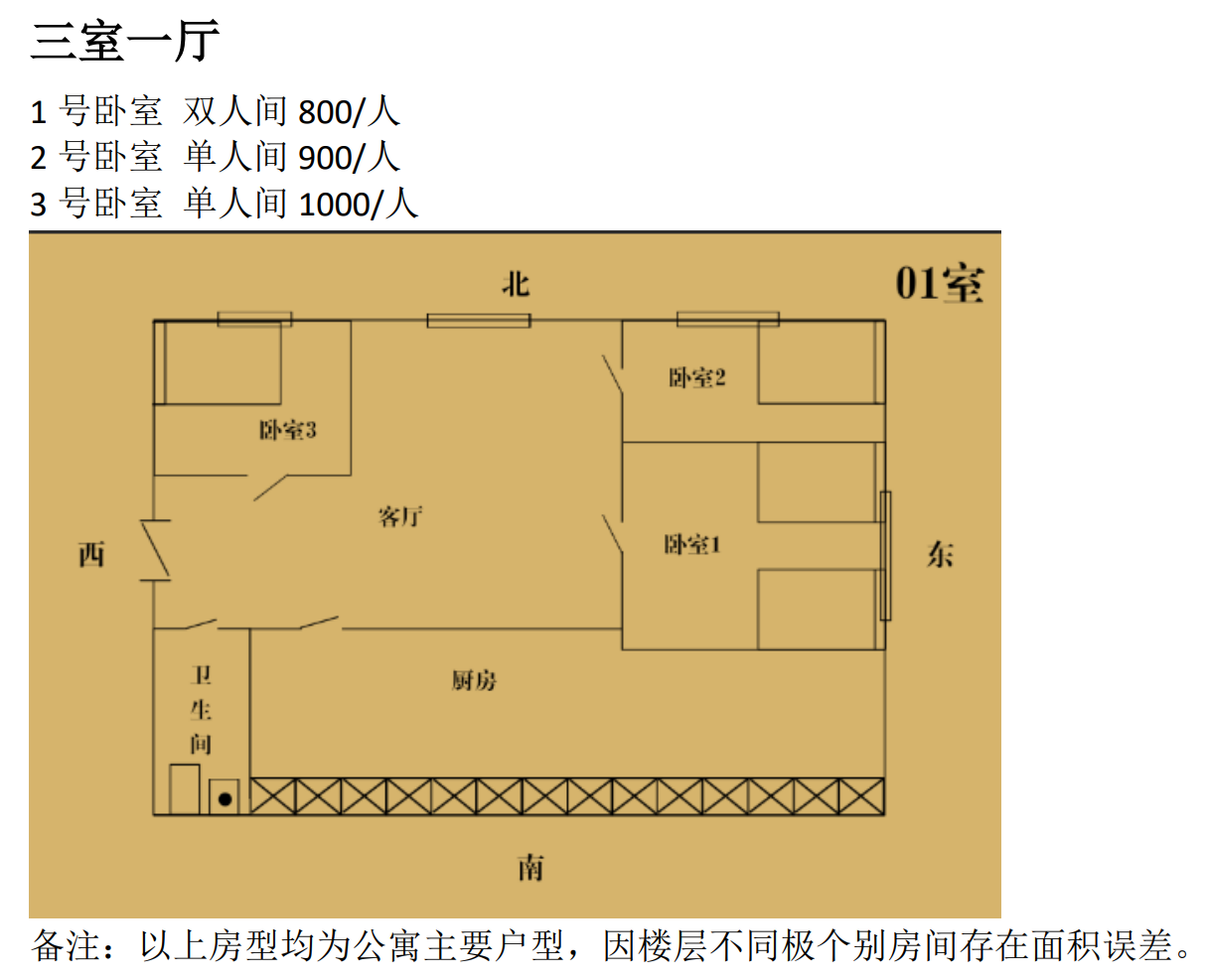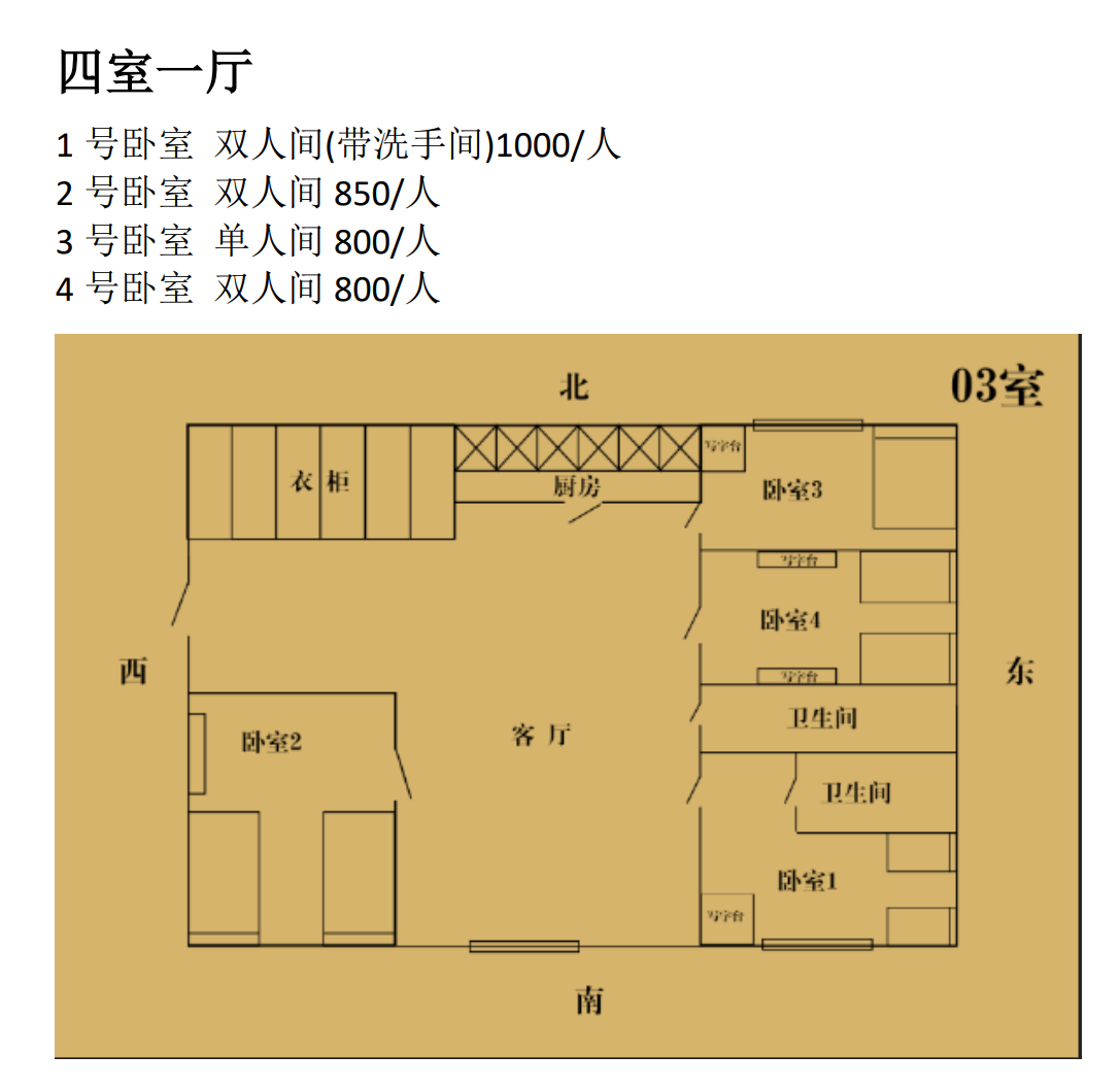 1호 룸 2인용(실내 화장실 있음) 1,000위안/월