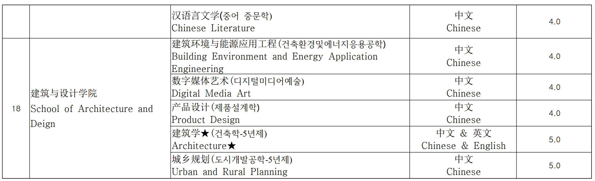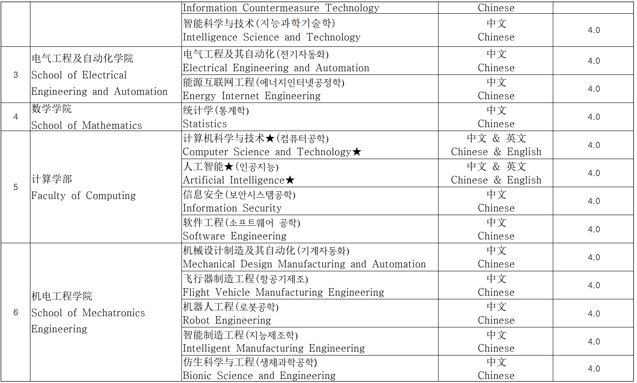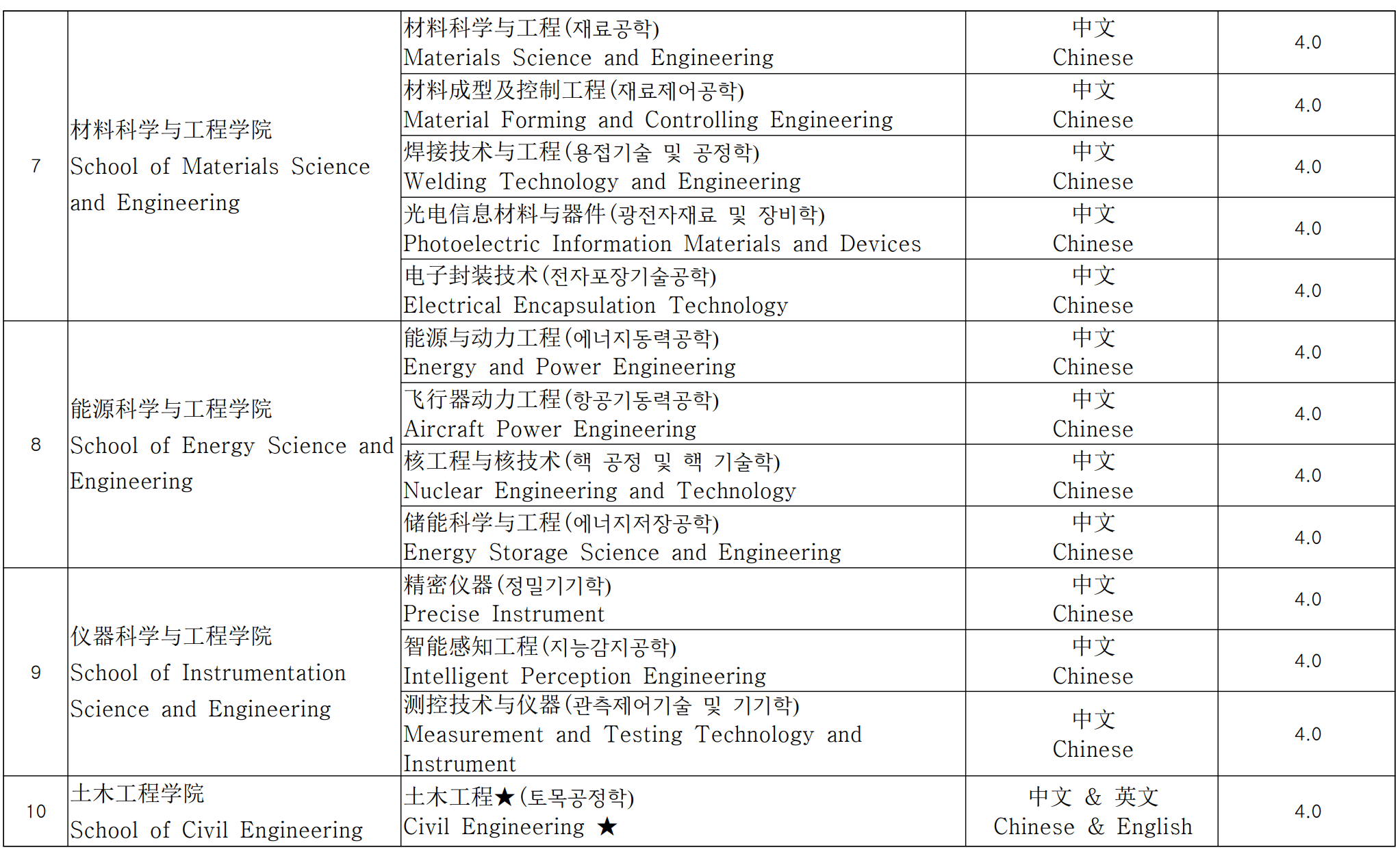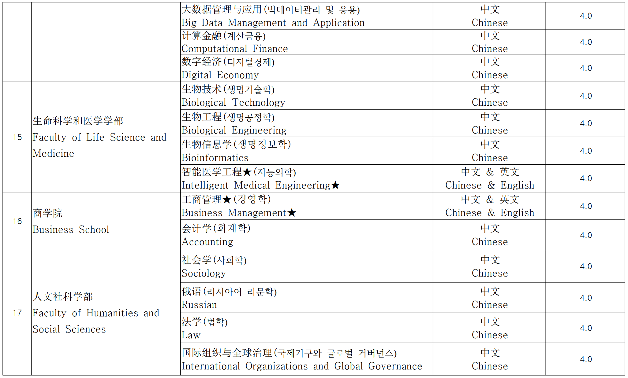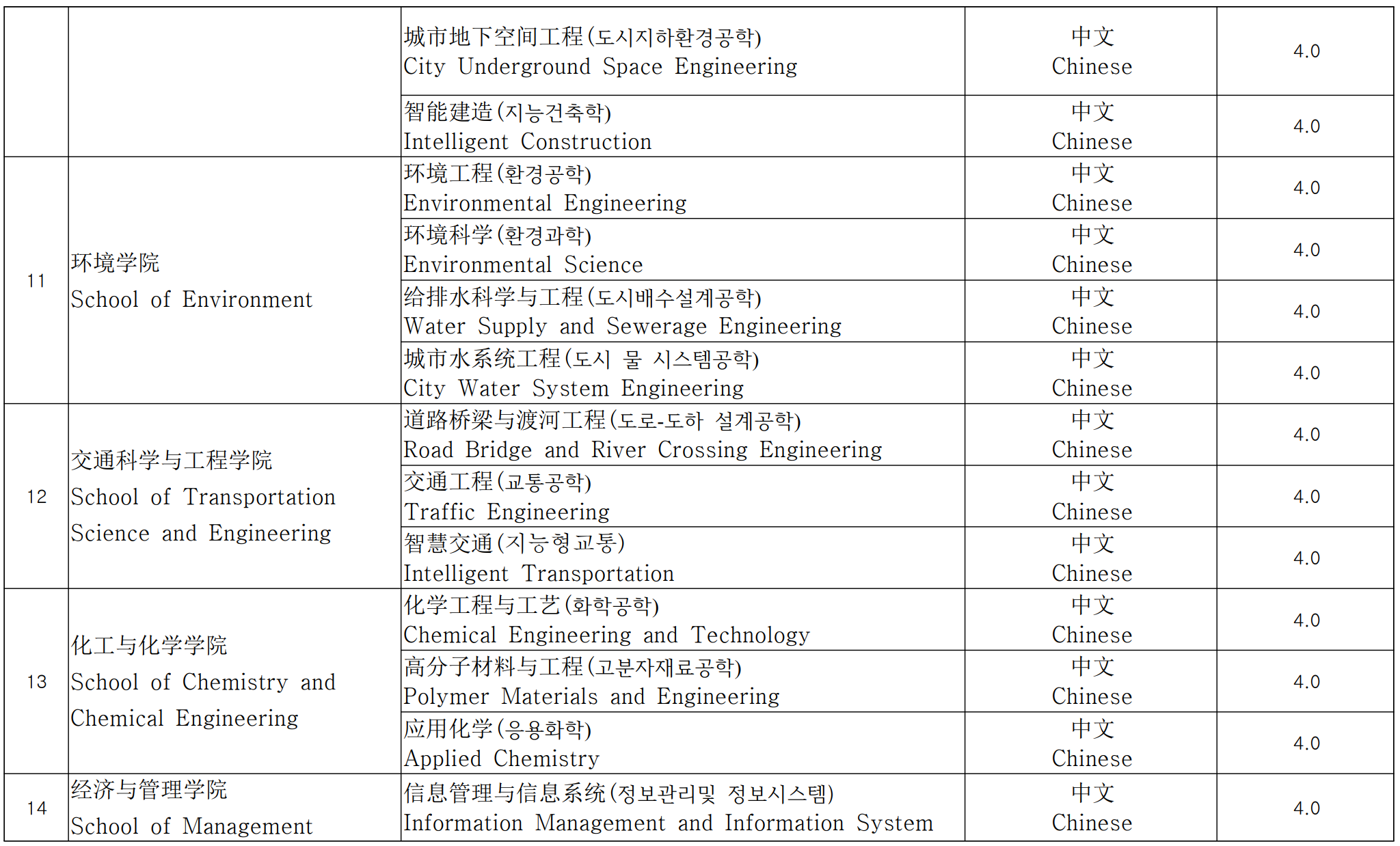 영어로 수업하는 학과의 능력은 최소 IELTS 6.0 또는 TOEFL 80 이상, 또는 기타 인정된 동등한 영어 능력 기준이어야 합니다.
