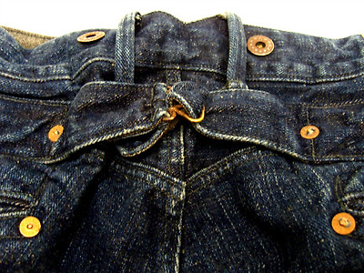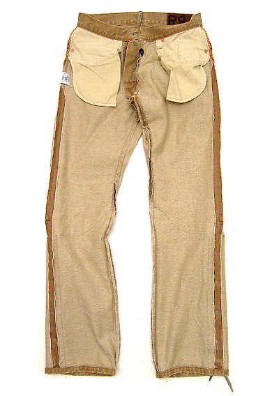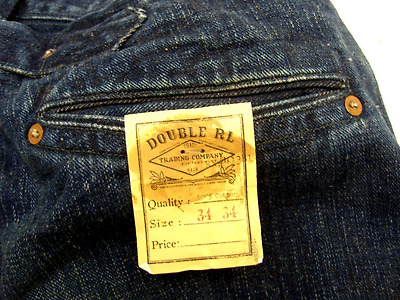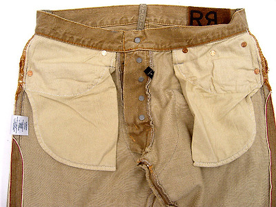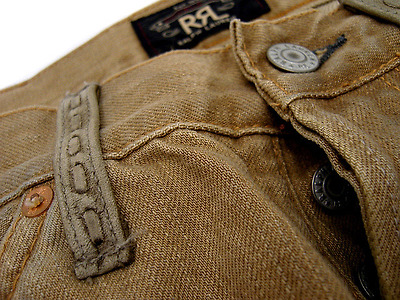 헤비데님에 더해진 더블알엘 고유의 헤비 카우하이드 브라운의 후면 태그와 활동성을 위한 후면 입체 재단.