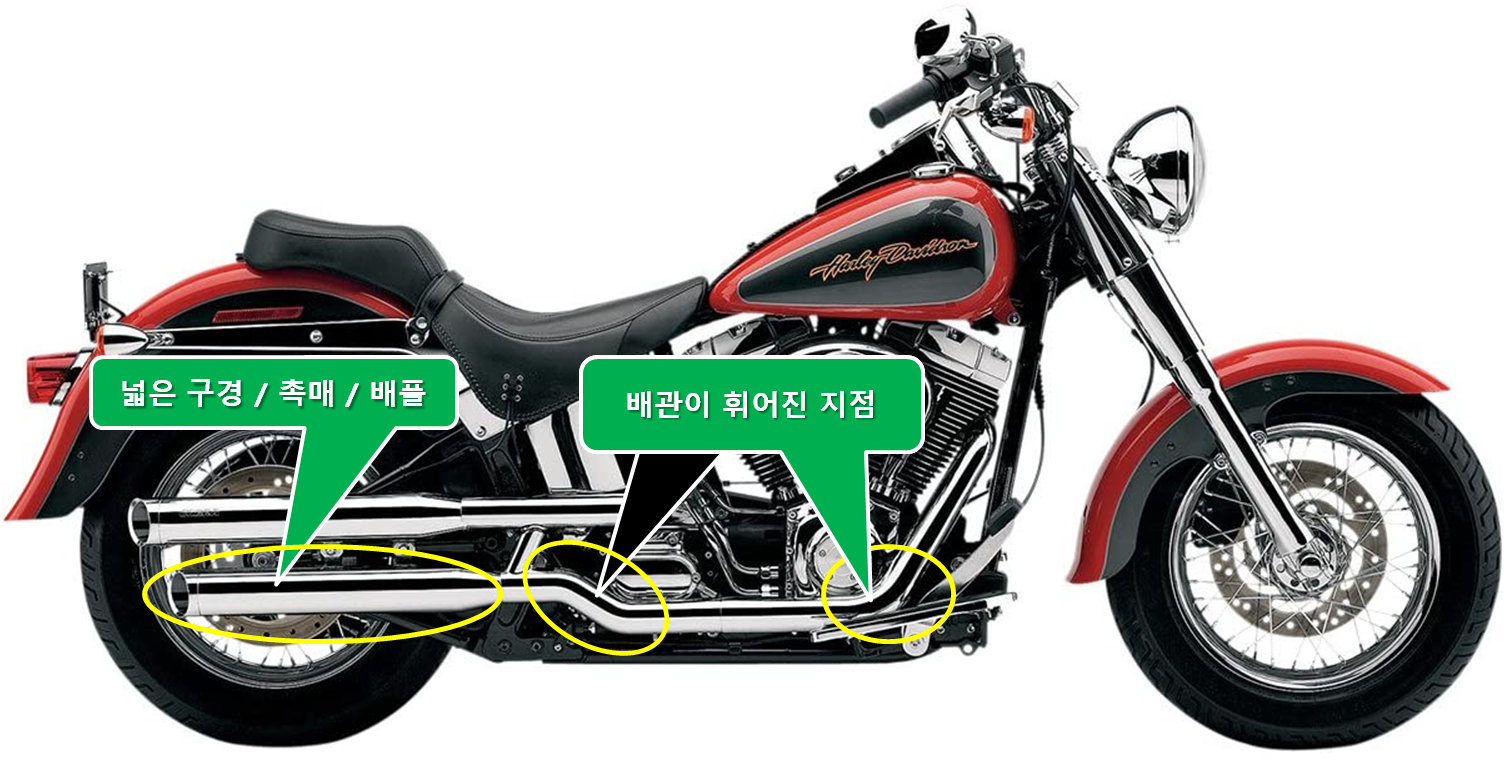 배기 파이프의 굴곡과 구경의 변화가
