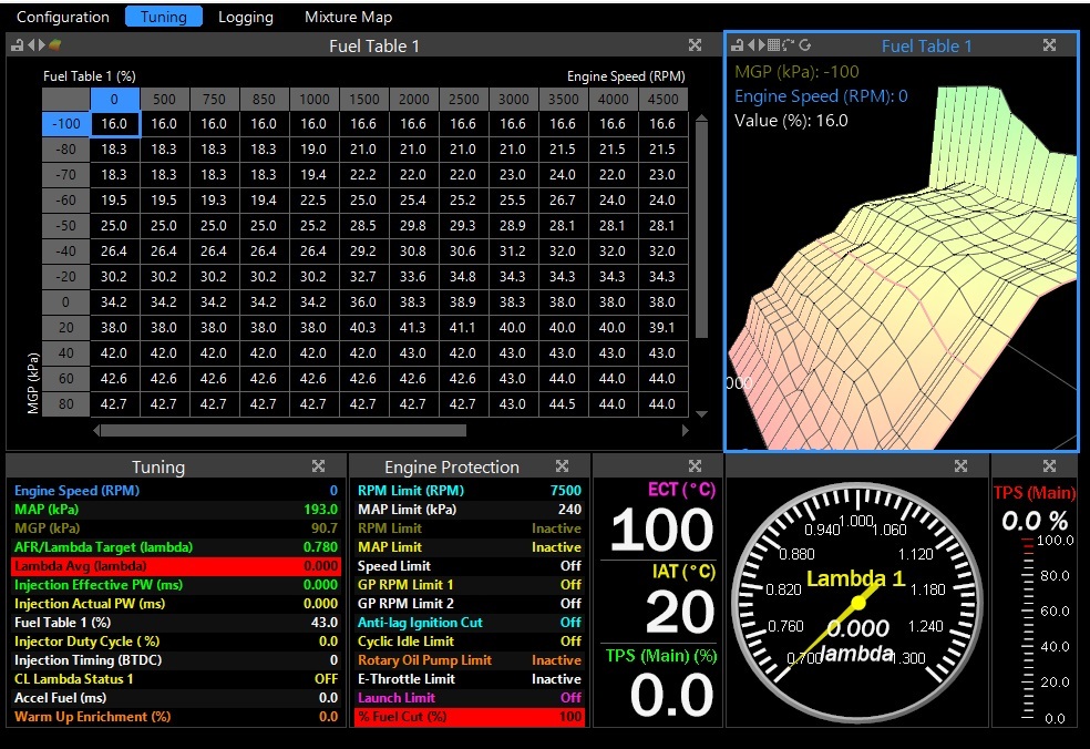 최대 RPM, 점화시기, 연료 분사량 등