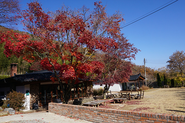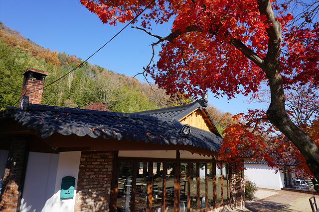 검은 한옥 지붕 위 빨간 단풍