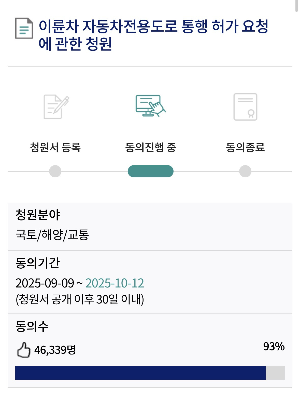 이륜차의 염원 전용도로 국민청원 동의