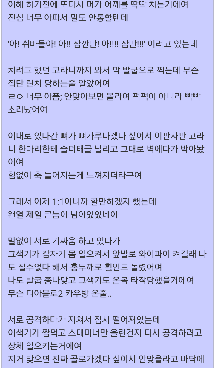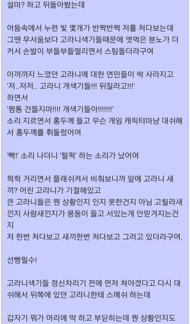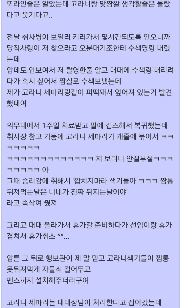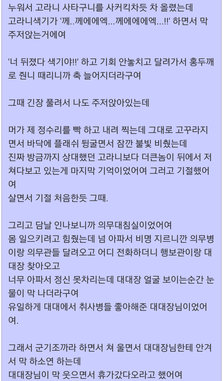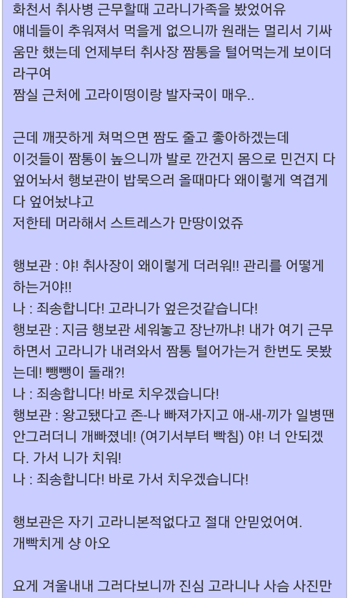 고라니 가족과 맞다이 뜬 군인. 작성자Z심포니Z|작성시간20.05.28|조회수1,447 목록 댓글 4 글자크기 작게가 글자크기 크게가 다굴 당한거 치고는 잘싸웟어 다음검색 현재 게시글 추가 기능 열기 북마크 공유하기 신고 센터로 신고 댓글 댓글 4 댓글쓰기 답글쓰기 댓글 리스트 작성자광개토소년 | 작성시간 20.05.28 ㅎㅎ 작성자시흥강철이 | 작성시간 20.05.28 ㅋㅋ 작성자부처핸썸(아산) | 작성시간 20.05.28 ㅋㅋ 작성자왕십리할리 | 작성시간 20.05.29 ㅋㅋㅋㅋㅋ 댓글 전체보기