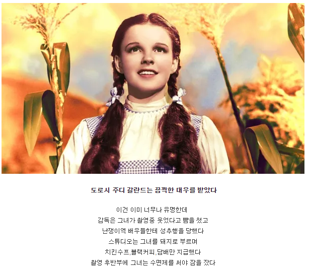 ㄹㅇ지옥이었던 오즈의 마법사 촬영현장 작성자Fxr1340|작성시간21.05.24|조회수1,241 목록 댓글 2 글자크기 작게가 글자크기 크게가 주디 갈란드는 부모님의 욕심과 소속사의 혹사와 학대로 인해급격히 망가지고47세의 나이로 약물과다복용으로 사망하게 된다엄청난 명작영화라는데 어두운면도 엄청나네 다음검색 현재 게시글 추가 기능 열기 북마크 공유하기 신고 센터로 신고 댓글 댓글 2 댓글쓰기 답글쓰기 댓글 리스트 작성자HOON(NOMAD) | 작성시간 21.05.24 헉~~ 작성자ManiaC | 작성시간 21.05.24 예술이 이래서 힘들다는거군요 댓글 전체보기