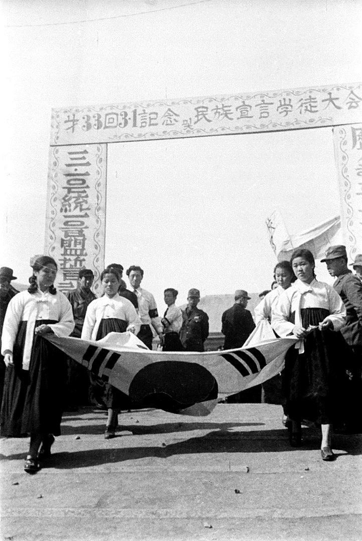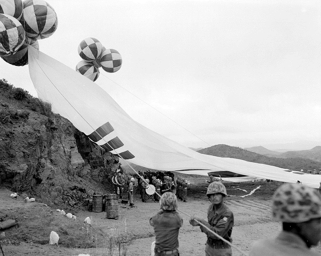 1962년 휴전선에서 광복절 기념으로 열린 대형 태극기 게양식 모습.