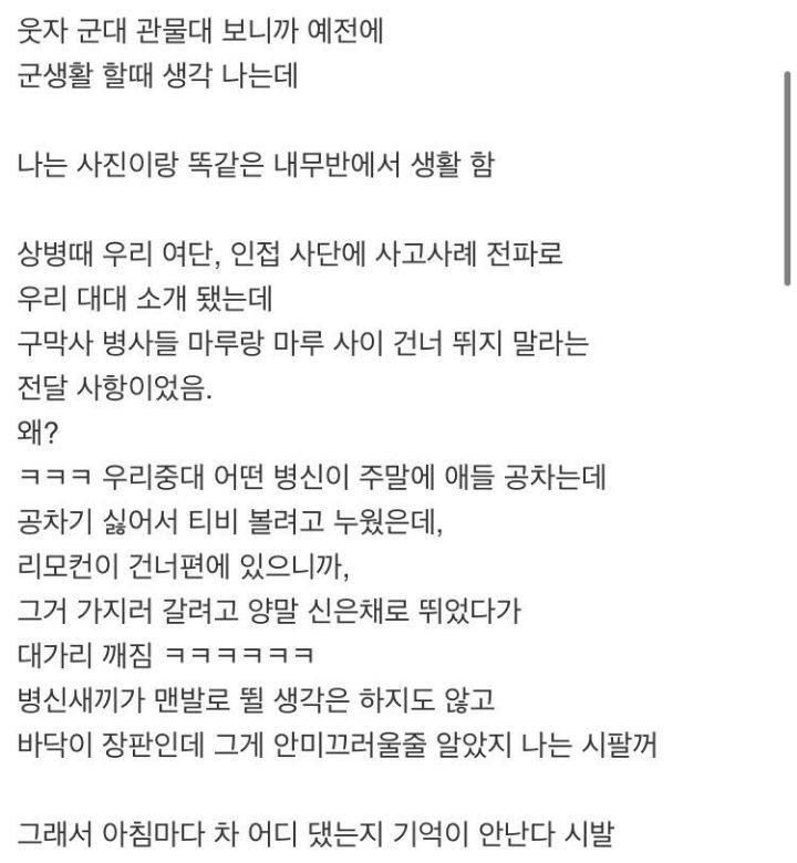 군대 구막사 사고 작성자Z심포니Z|작성시간22.05.21|조회수2,036 목록 댓글 4 글자크기 작게가 글자크기 크게가 내무반 침상 사이 건너뛰다가 미끈러져서 대가리 깨짐 다음검색 현재 게시글 추가 기능 열기 북마크 공유하기 신고 센터로 신고 댓글 댓글 4 댓글쓰기 답글쓰기 댓글 리스트 작성자옹박 | 작성시간 22.05.21 침상간 꼴아박어(원산폭격)하여 마빡 5cm 들어간기억나네요^^ 작성자파로 | 작성시간 22.05.21 바닥이 장판 군대 좋아졌을때네 써글 바닥 송판에 못튀어나온 고때가 서러웠지 . 작성자산 야 | 작성시간 22.05.21 난 난상무대 공병대대 헐 우리 내무반인줄 ㅋ 작성자브아조아 | 작성시간 22.05.22 치약 가지고 쫄때 광내고 ㅋㅋ그때생가나네요 댓글 전체보기