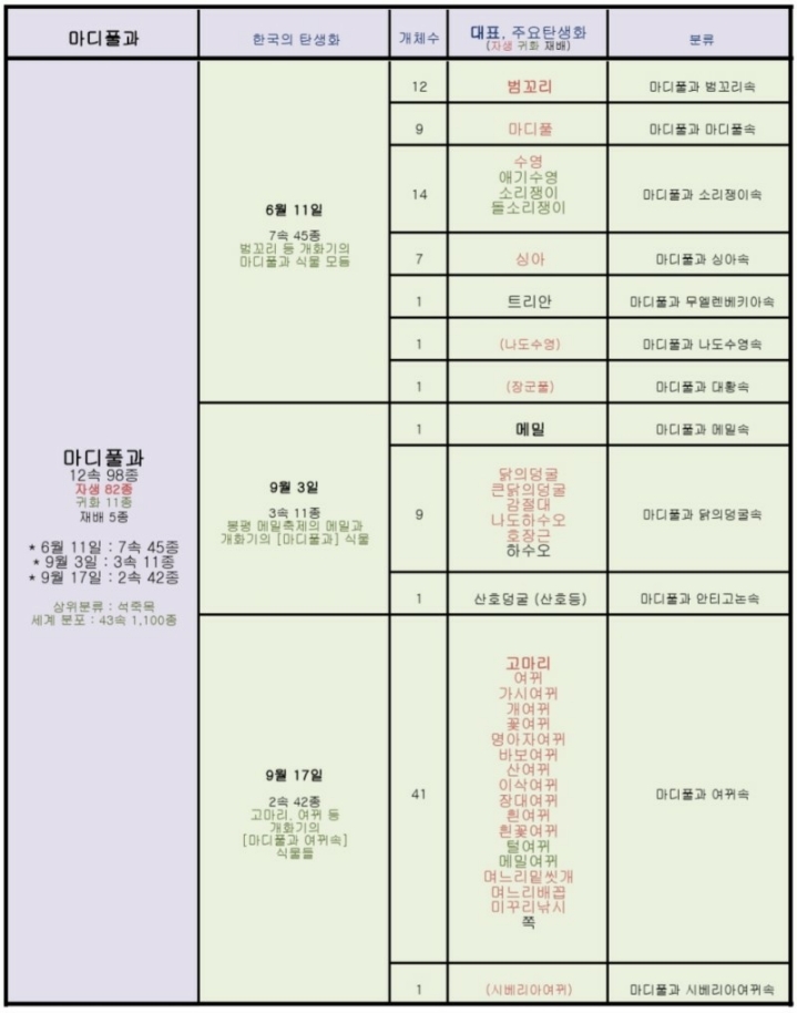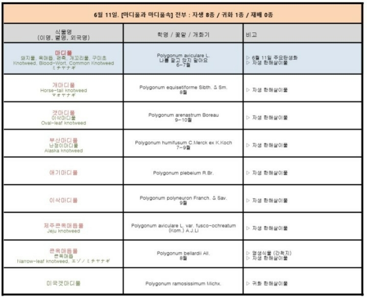 * 주요탄생화 : 마디풀, 싱아, 수영, 애기수영, 소리쟁이, 돌소리쟁이, 트리안