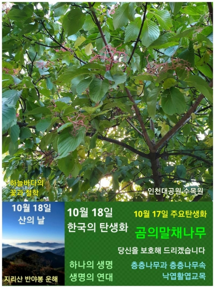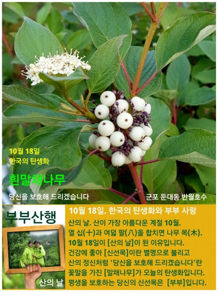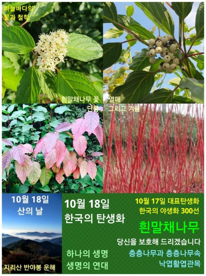 오늘 산의 날을 기념하는 한국의 탄생화는 [신선목] [빼빼목]이란 별명을 가진 [말채나무] 삼형제입니다. 복용하면 이뇨작용을 도와주고 체지방 분해하여 몸을 빼빼하게 해 주어 신선처럼 가벼워진다해서 붙여진 별명입니다.